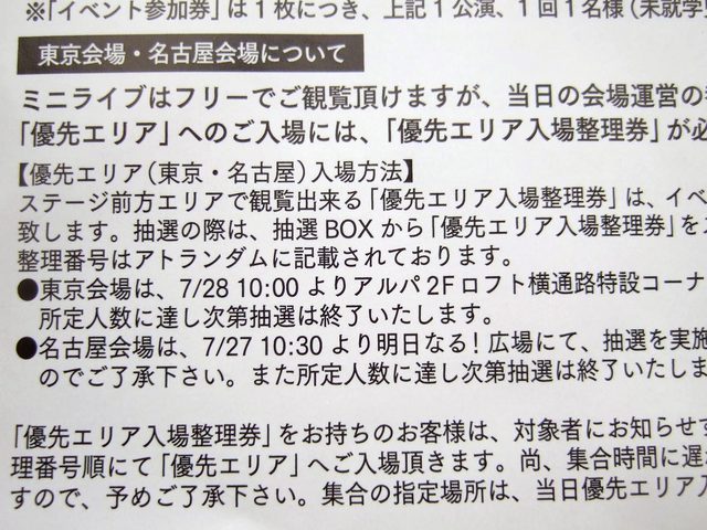 webには「9:00より抽選配布」って書いてあったけど、参加券には「10:00より~」って書いてあって あれあれどっちだろと思ってたら、webの方も10:00に修正されとるw東京会場は「先着順の整理番号抽選配布」なのに対して 名古屋会場は「抽選でハズレの可能性あり」との事。さすがお膝元!こりゃ大変だ(^^;http://www.jvcmusic.co.jp/flyingdog/-/Information/A021682.html?article=news69#news69#mayn